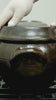 PURPLE WINE STAINS ON AN OLD LEATHER JOURNAL.